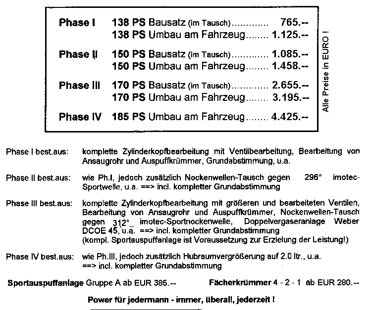 Die Leistungsangaben gelten, wenn die Bausätze, in Verbindung mit einwandfreien Unterbauten, in unserem Hause komplett montiert und prüfstandgelaufen wurden! Bei den hier aufgeführten Modifikationen handelt es sich um Motoren für den Sporteinsatz. Alle Preise in Euro, incl. Mwst. |